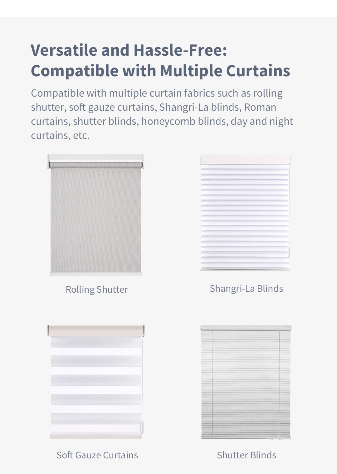 - 適用於捲簾、香格里拉簾、柔紗簾、百葉簾、蜂巢簾、羅馬簾、日夜簾