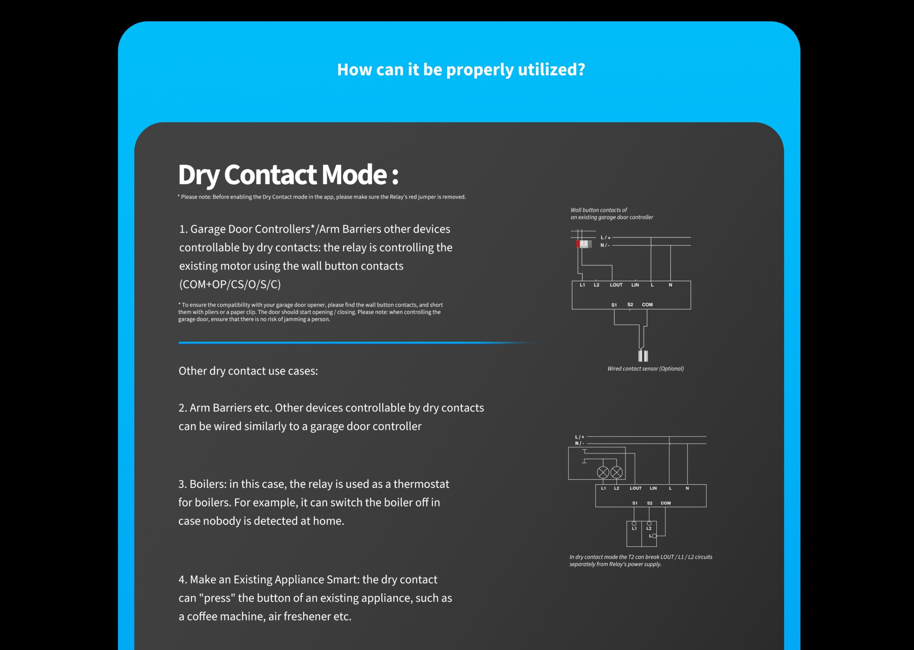 - 可控制捲簾、窗簾電機、車庫的自動控制門、遮陽篷、電動大門、電動推拉門、泳池蓋、可以使用雙向交流電機