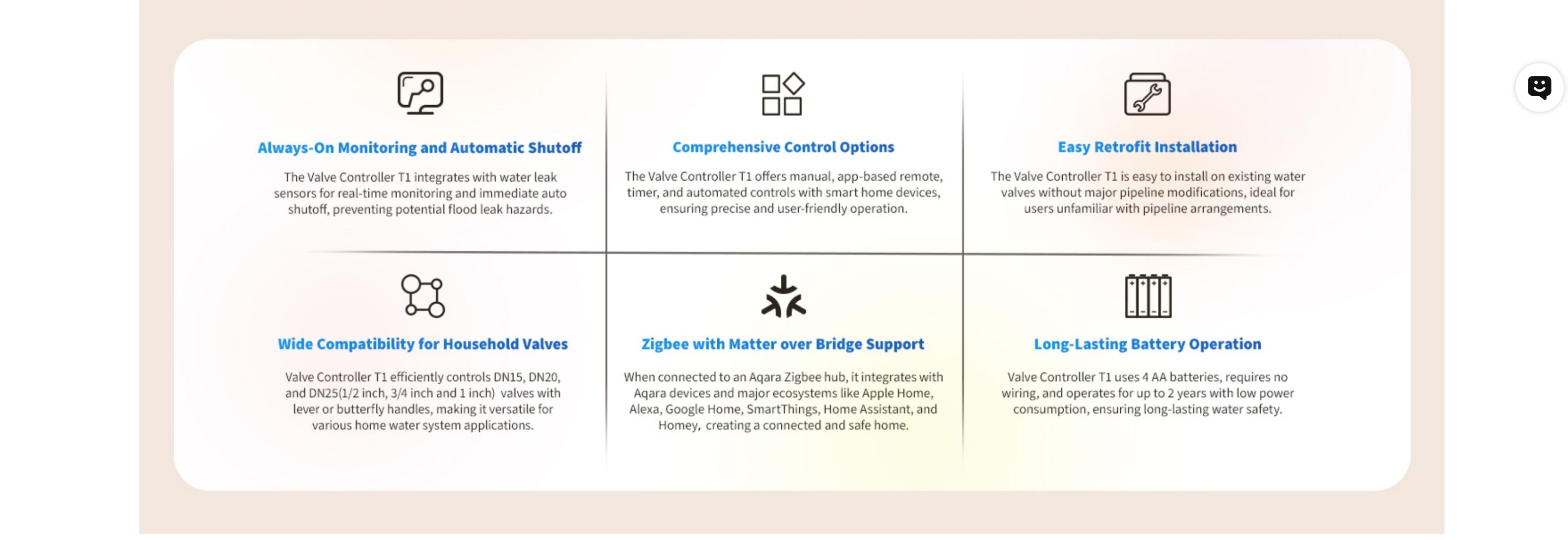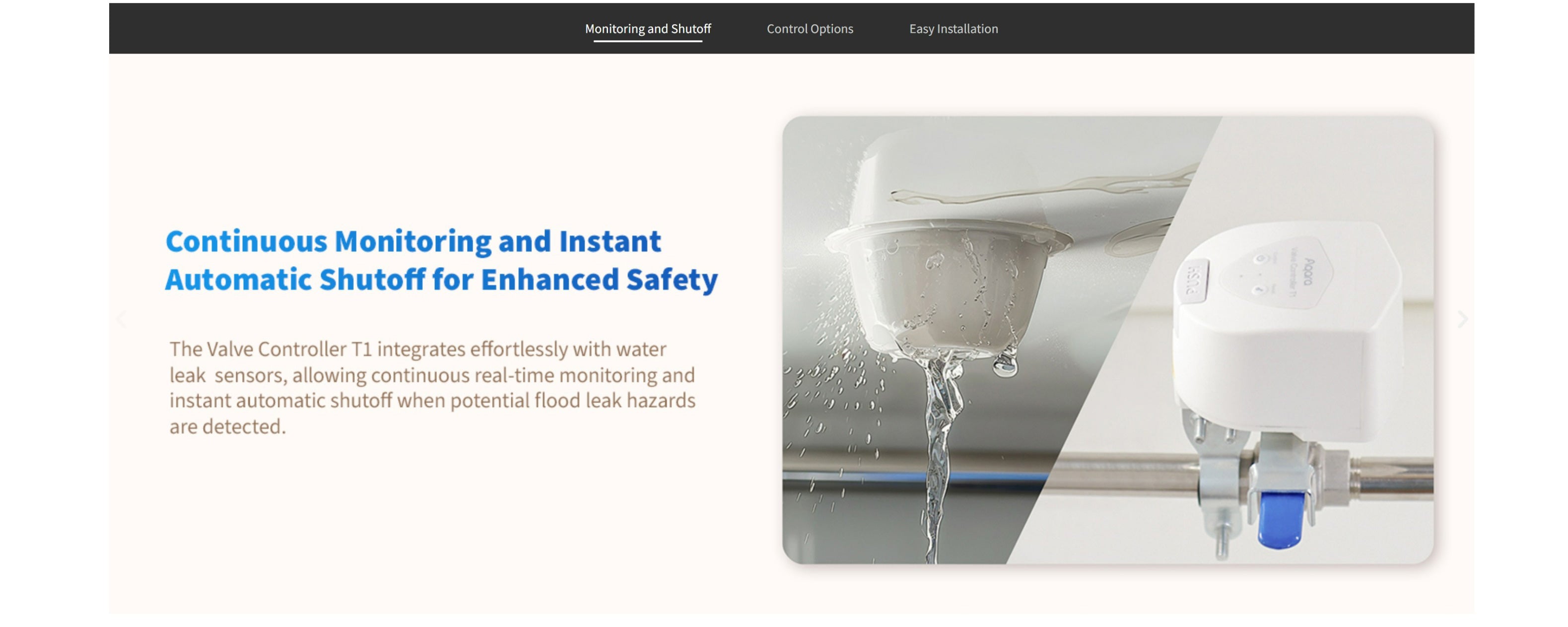 - 持續監察漏水並於 5-20 秒內自動截斷水源,有效防止水浸帶來的損失 (需配合Aqara 水浸感應器使用)