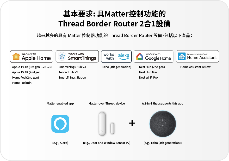 將設備新增支援 Matter 的應用程序,您裝置需要同時具有 Matter 控制功能和Thread Border Router的設備。針對不同情況有多種選擇: