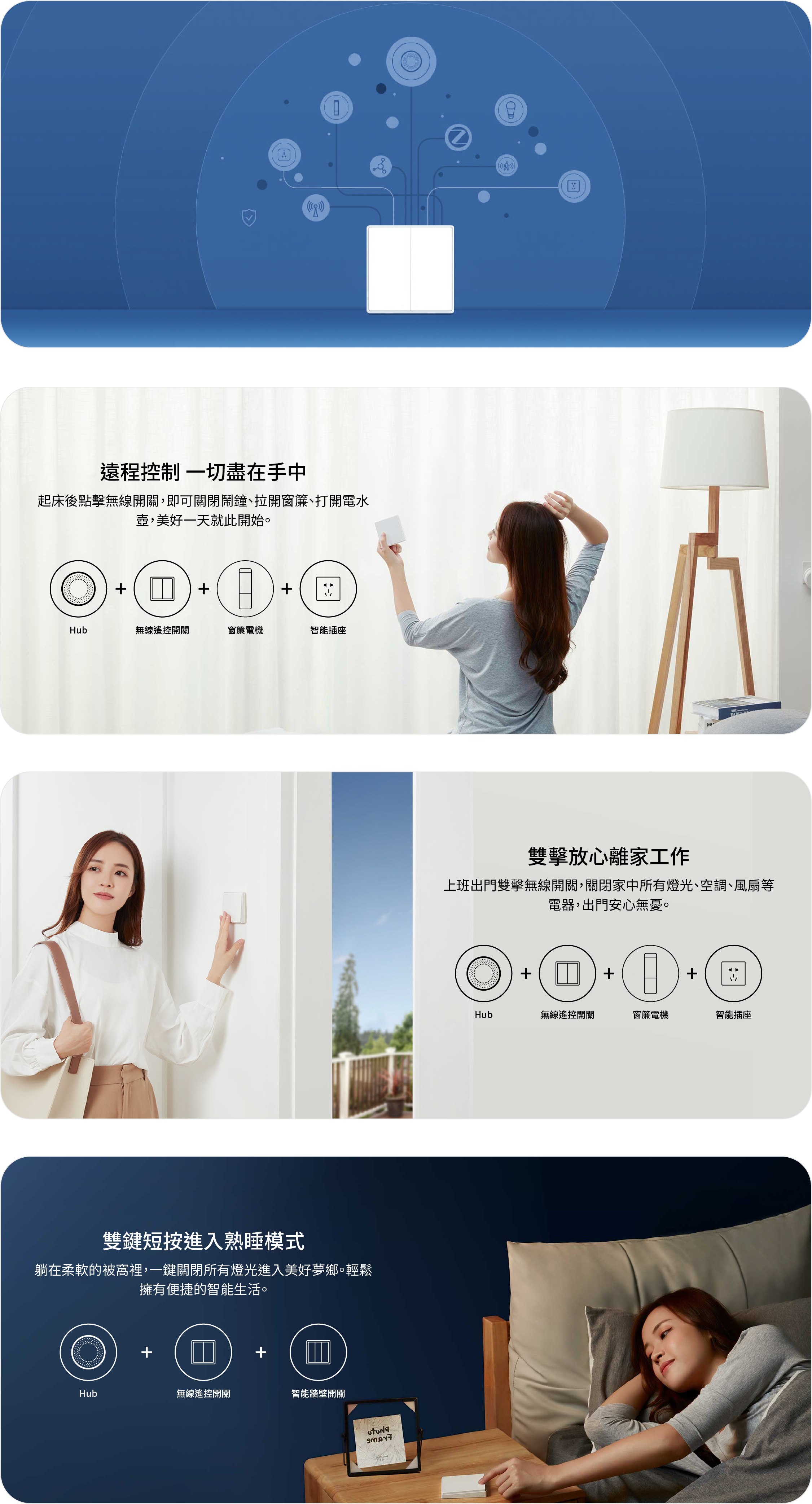 你可以根據自己的使用習慣,給每一個操控動作自訂一個場景,一個開關控制多種場景