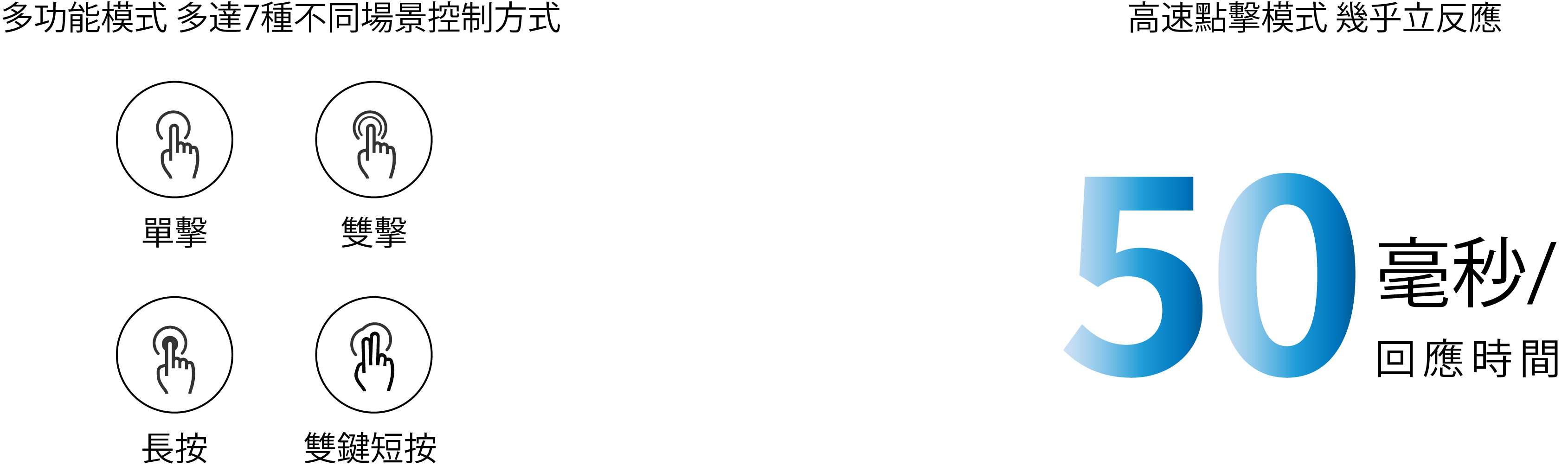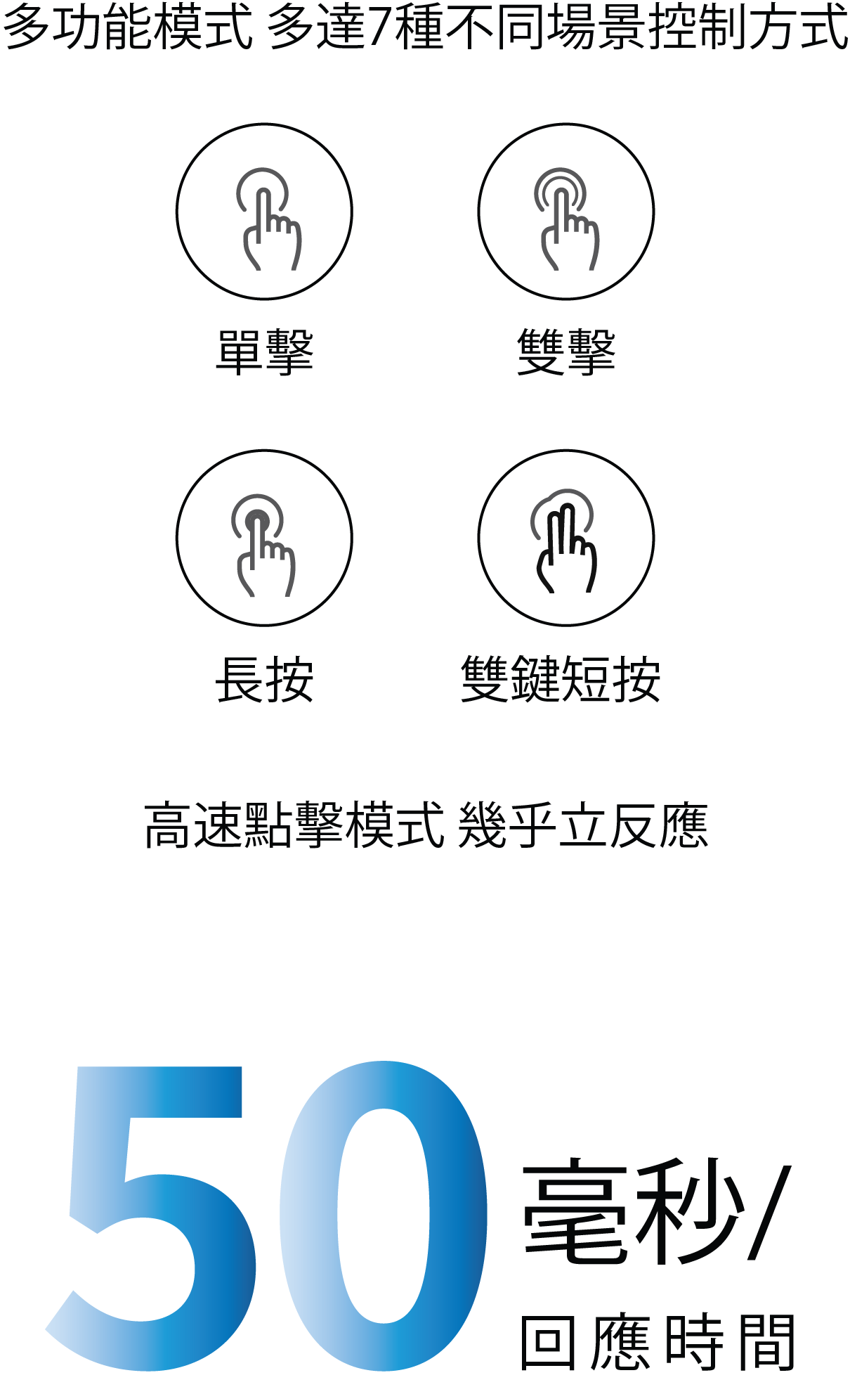 - 支援高速單/雙點擊 或 長按控制,一按即開低時極延