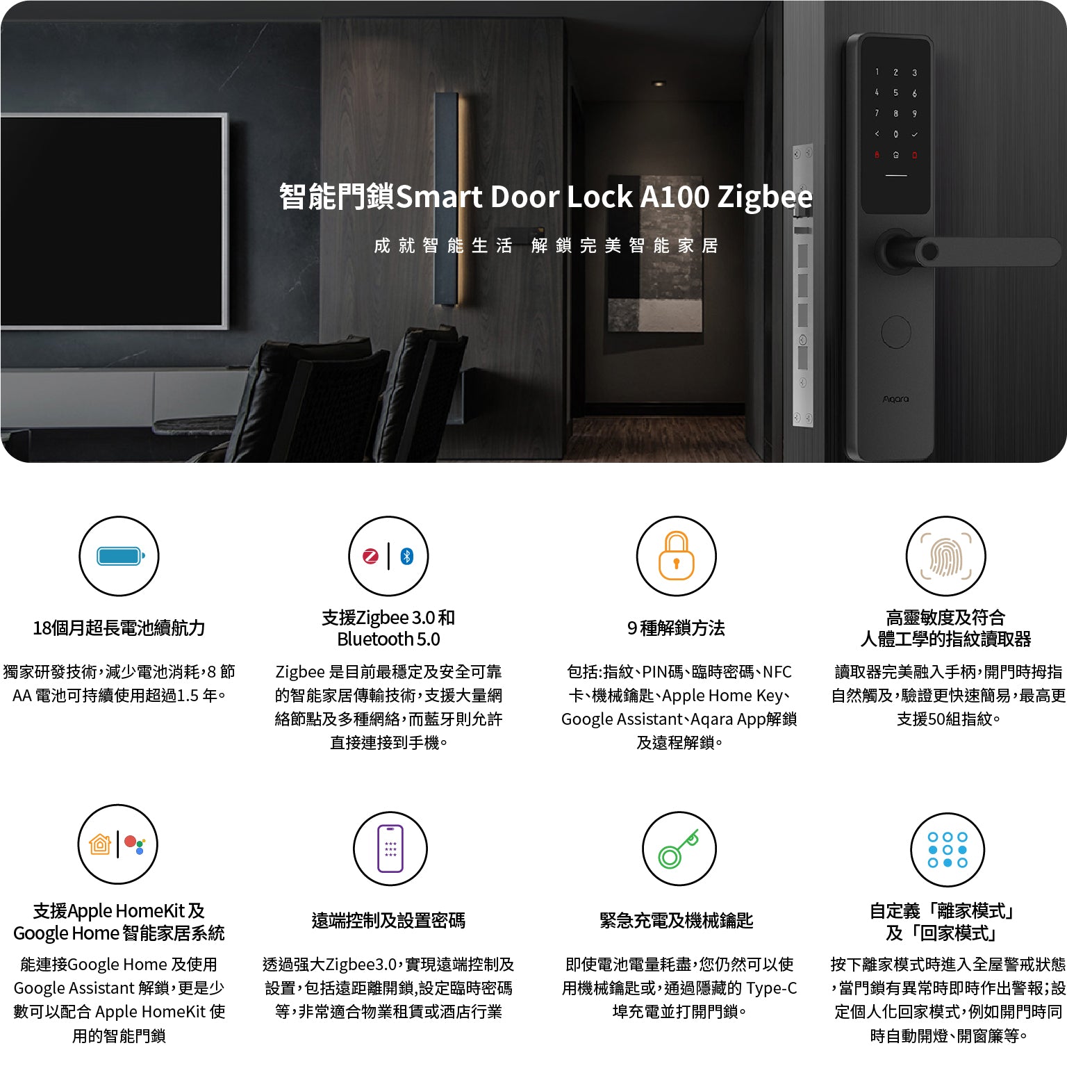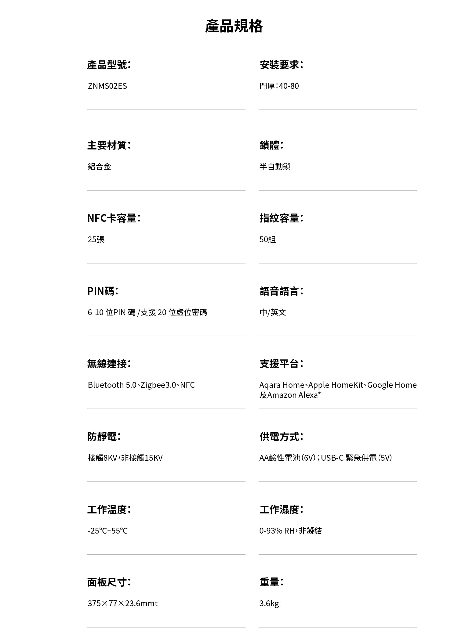 Aqara 智能門鎖 A100 ZigbeeAqara Smart Door Lock A100 Zigbee型號:ZNMS02ES 尺寸/重量:375 × 77 × 23.6mm 語音語言:中/英文真人語音 電池規格:6V DC 防靜電:接觸 8KV,非接觸 15KV RTC精度:20.075ppm,±1.73s 無線協議:Bluetooth 5.0、Zigbee3.0 包括:機械鑰匙×2、AA電池×8 安裝要求:門厚 40 - 80mm