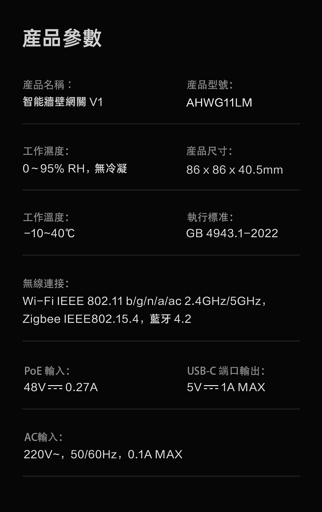 Aqara 智能牆壁網關 V1Aqara Smart Wall Hub V1型號:AHWG11LM (CN Package) 尺寸:86 x 86 x 40.5 mm 揚聲器: 無線協議:雙頻 額定輸入:AC 220V, 50/60Hz, 0.1A Max PoE供電規格:DC 48V -- 0.27A 工作溫度: -10°C ~+40°C 工作濕度:0%~95%, RH, no condensation 安裝箱深度 (最小): 27mm