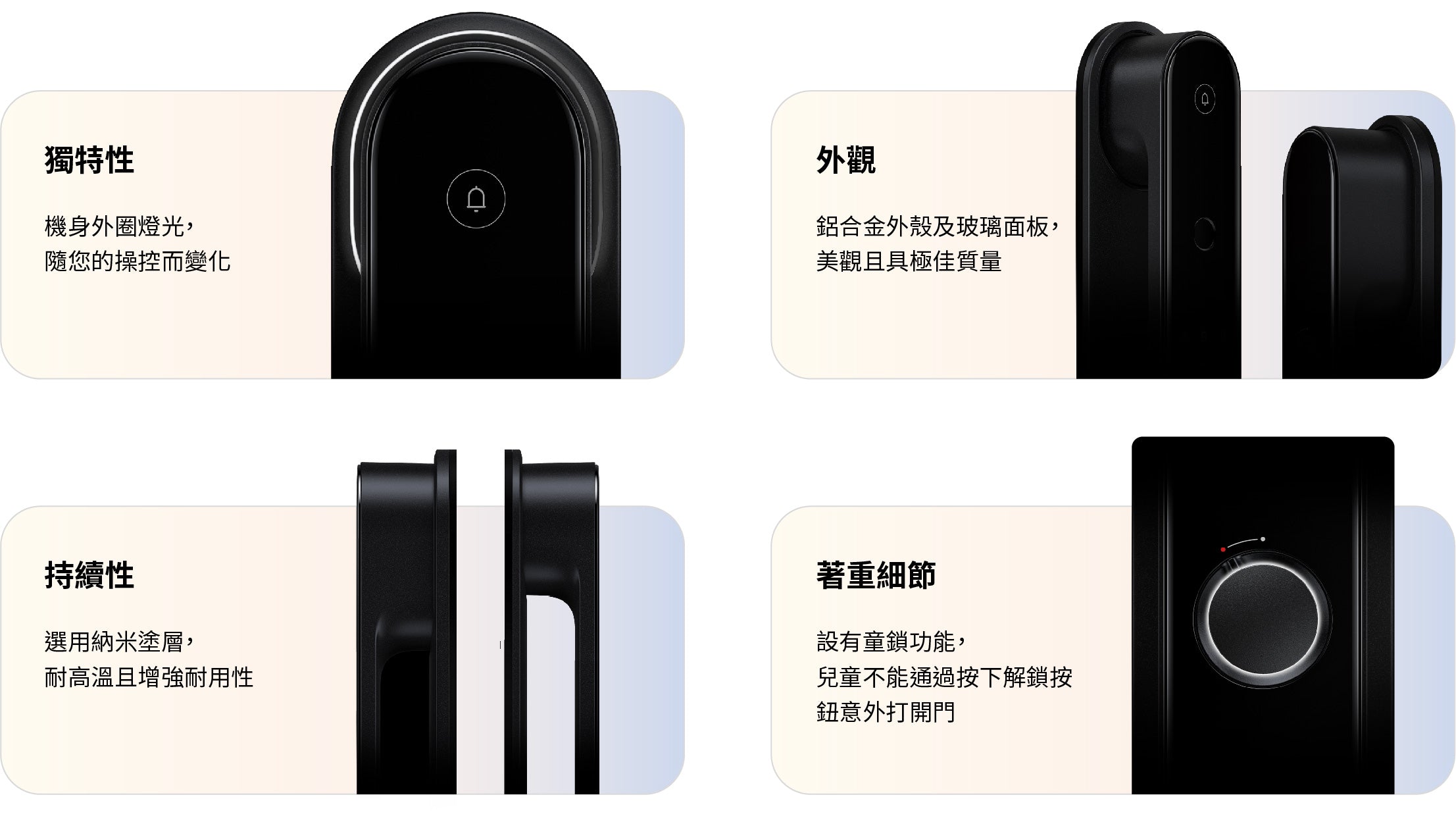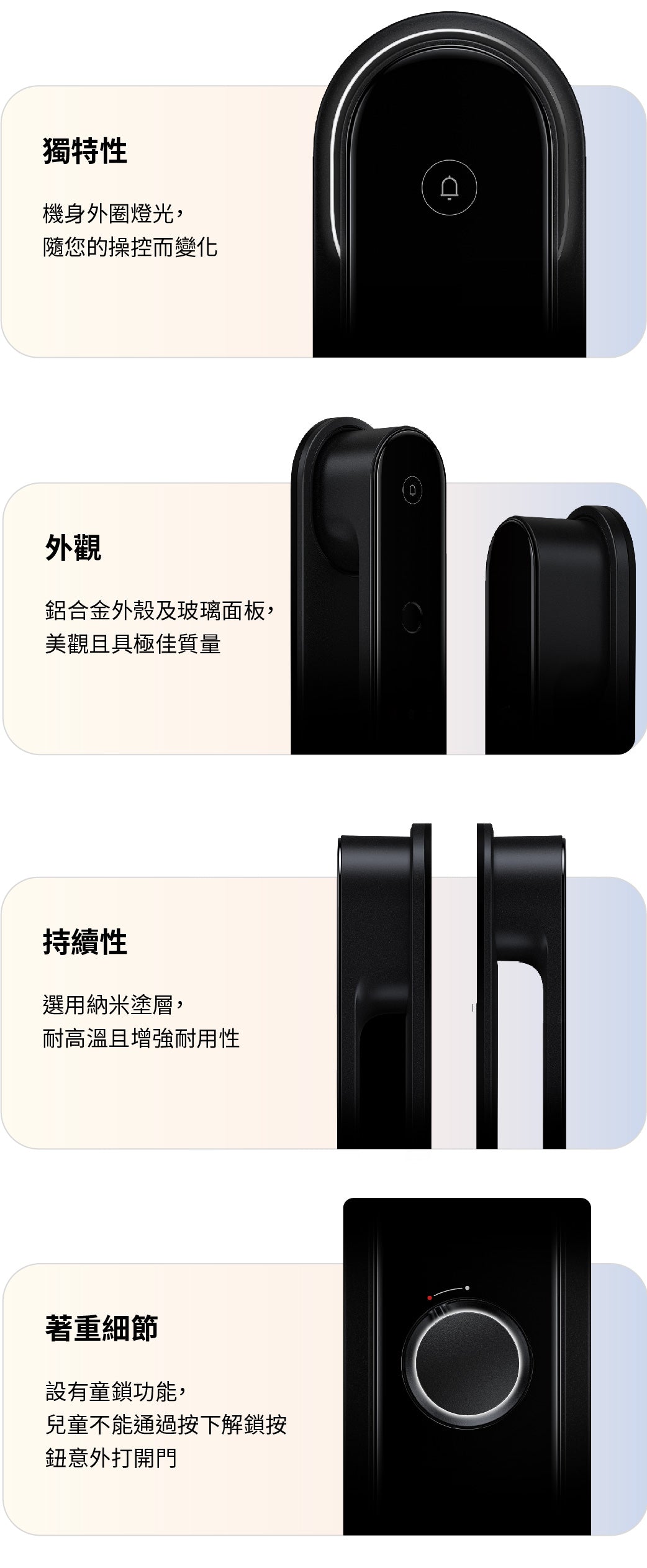 - 加設童鎖功能,兒童不能通過按下解鎖按鈕意外打開門鎖
