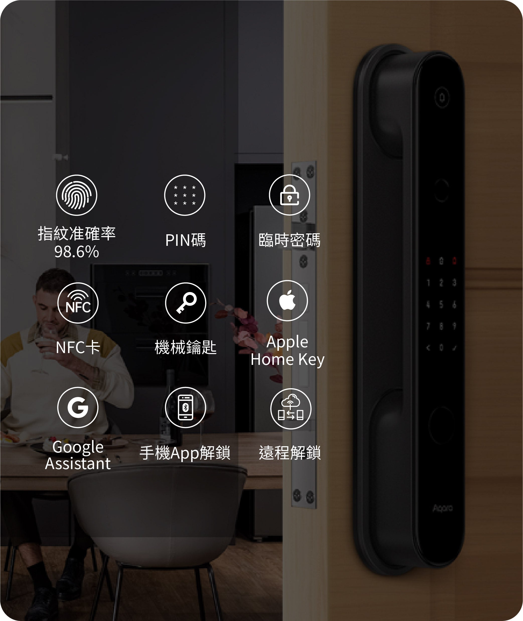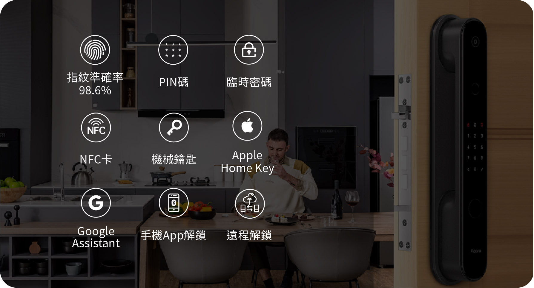 - 9種解鎖方式包括:指紋、PIN碼、臨時密碼、NFC卡、機械鑰匙、Apple Home Key、Google Assistant、Aqara App 解鎖及遠程解鎖