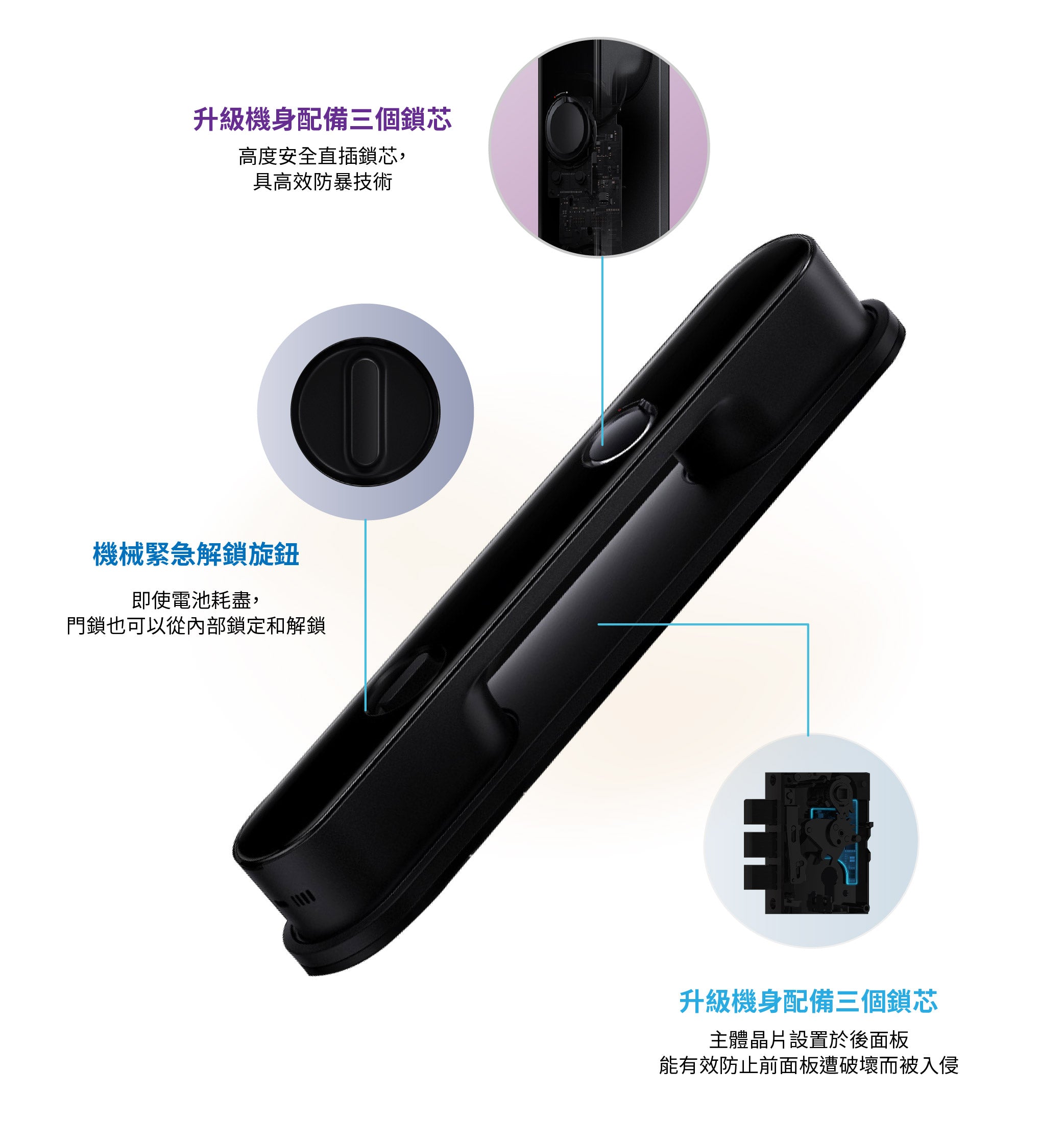 - 全自動鎖體,採用推拉式設計,大幅提升鎖體反應速度,自動解鎖及上鎖,無需二次操作