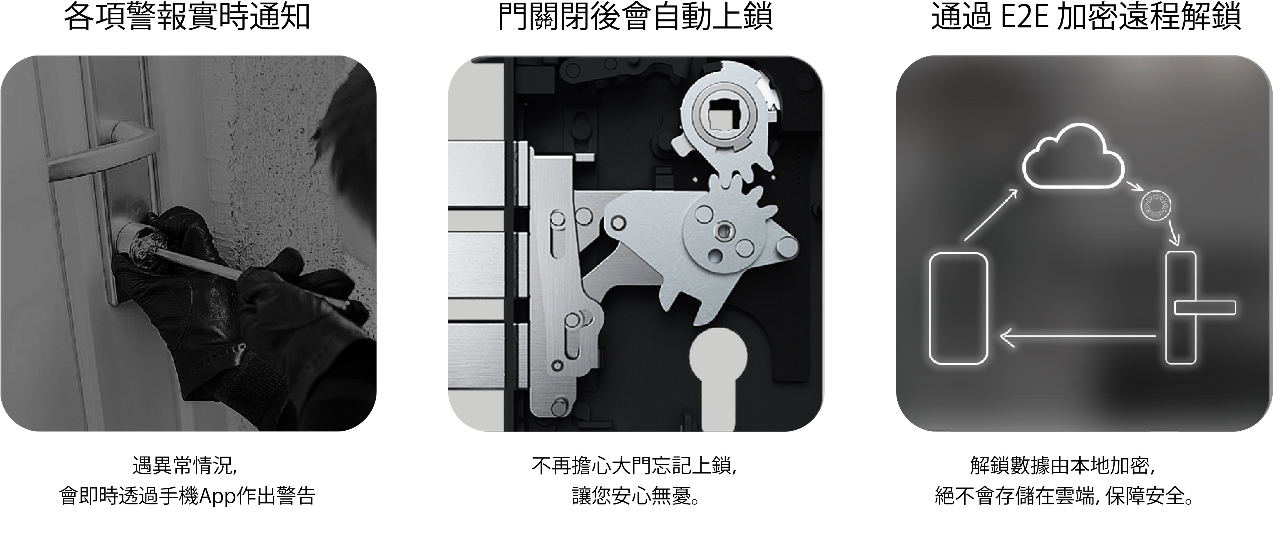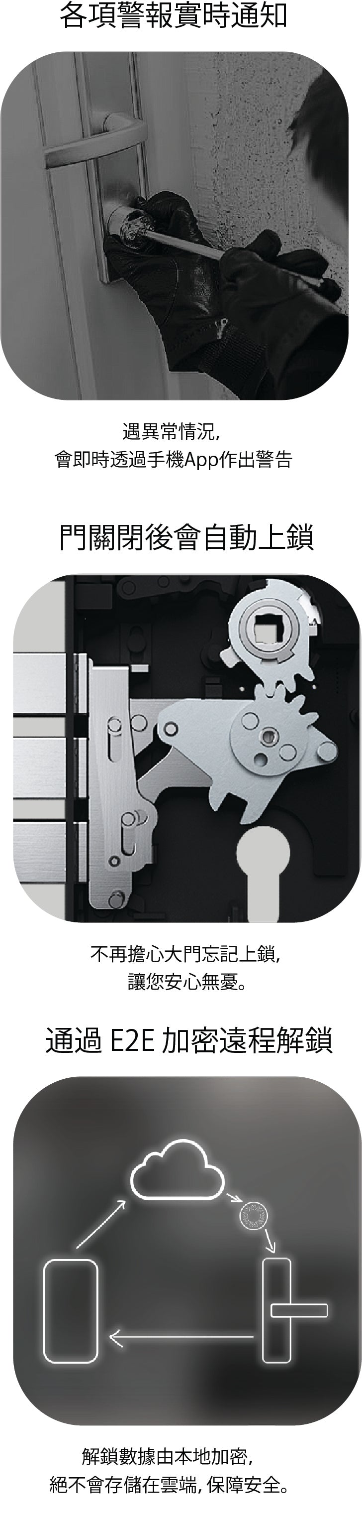 - 實時門鎖狀態記錄,支援手機即時推送通知:開鎖記錄、異常開鎖、多重驗證失敗等