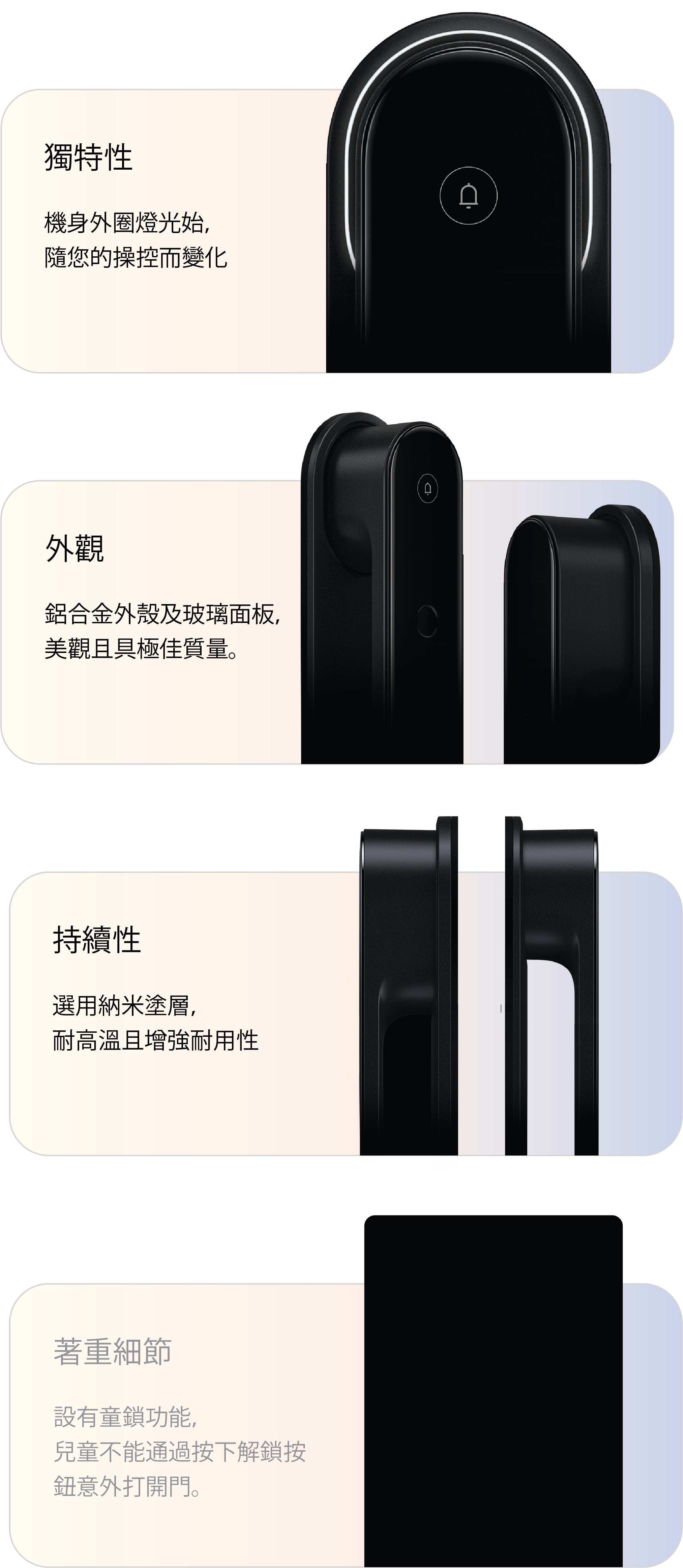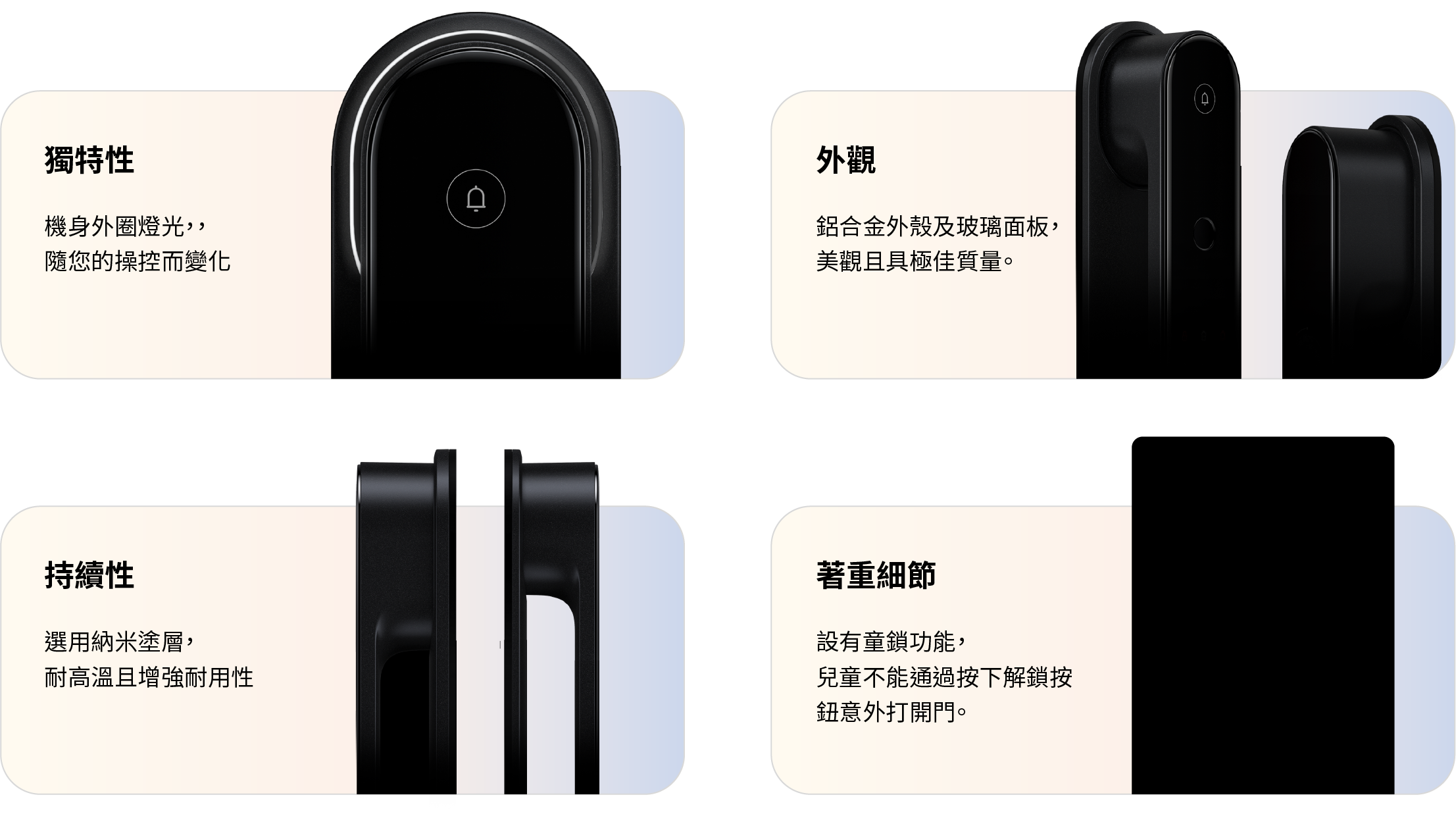 - 內置門鈴功能,透過手機 App 實時通知,並遙控開鎖 (包括遠程解鎖)