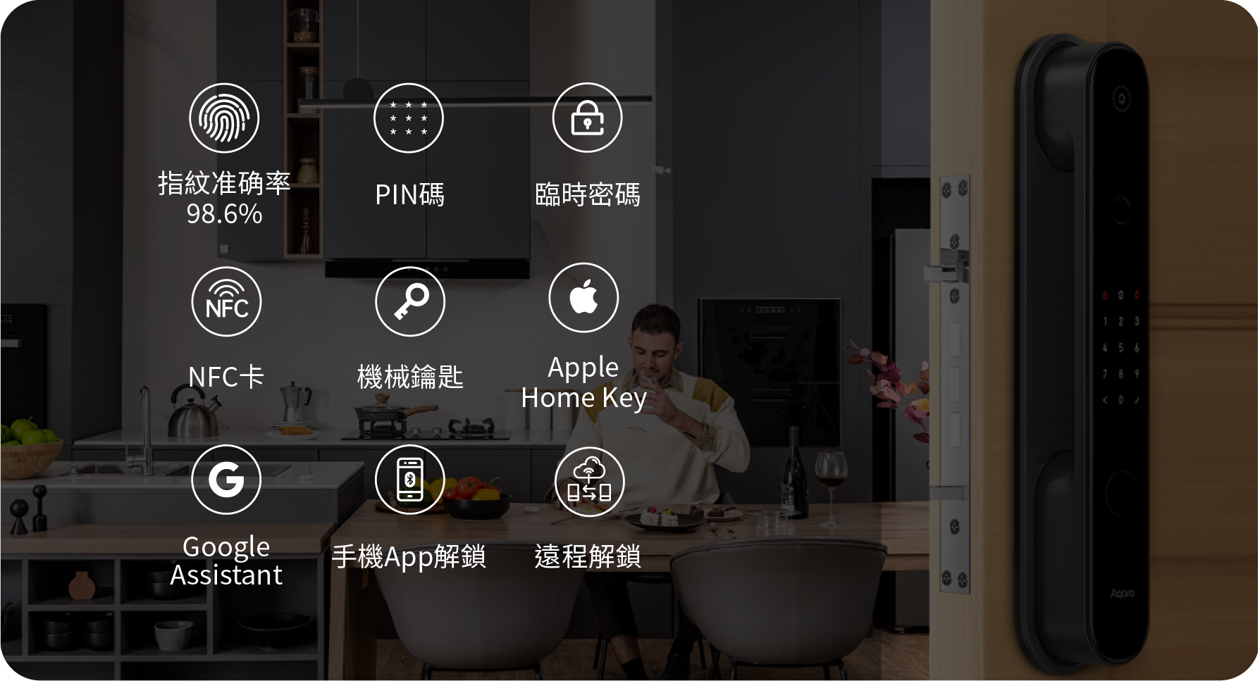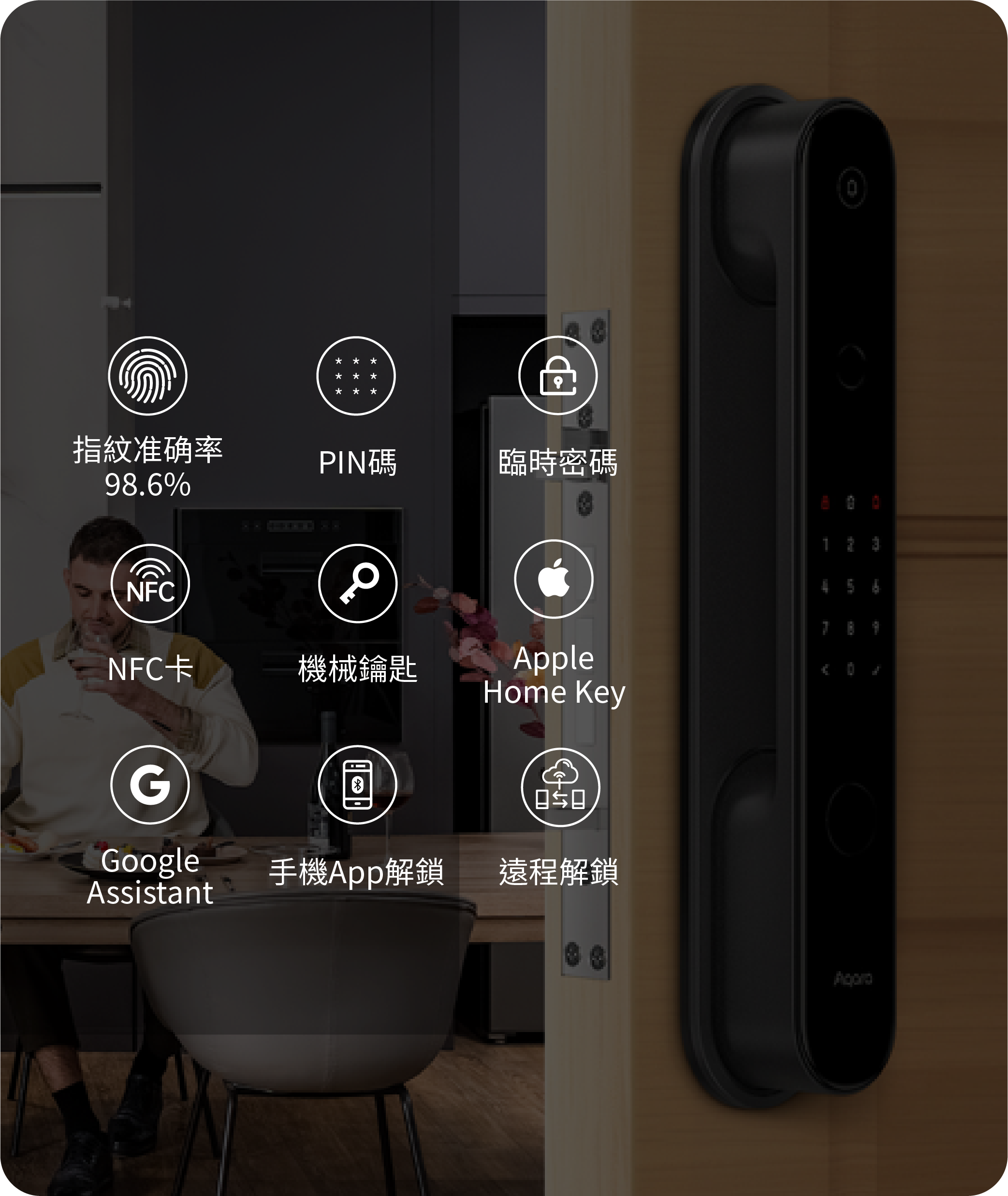 - 解鎖方式包括:指紋、PIN碼、臨時密碼、NFC卡、機械鑰匙、Apple Home Key、Google Assistant、Aqara App 解鎖及遠程解鎖